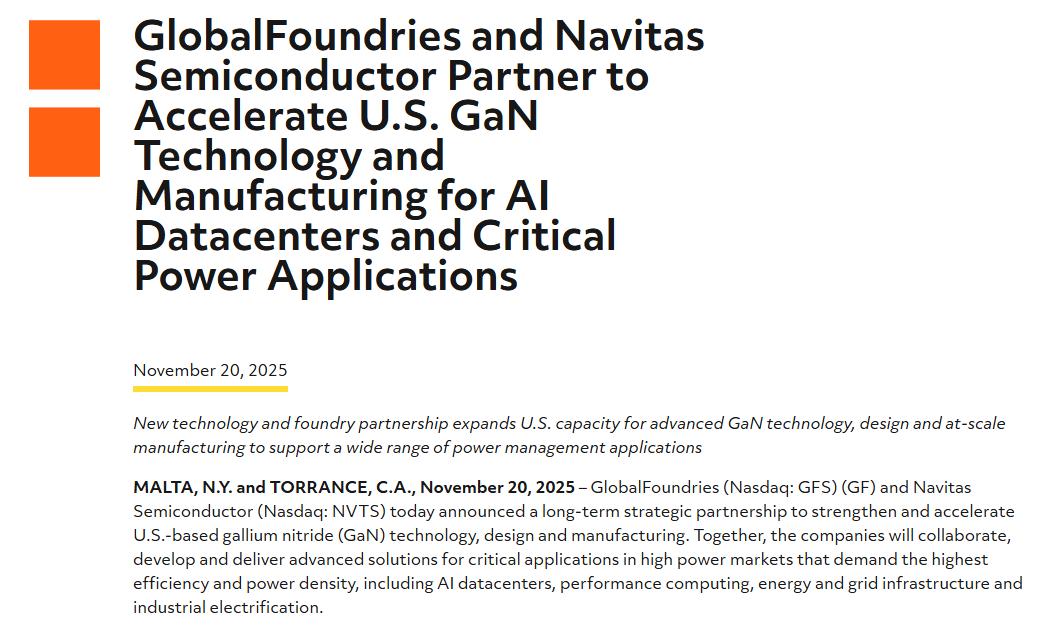 与此同时,格芯也与GaN龙头#纳微半导体(Navitas)达成深度结盟,双方将针对AI资料中心与电网基础设施,共同开发更高功率密度的解决方案。