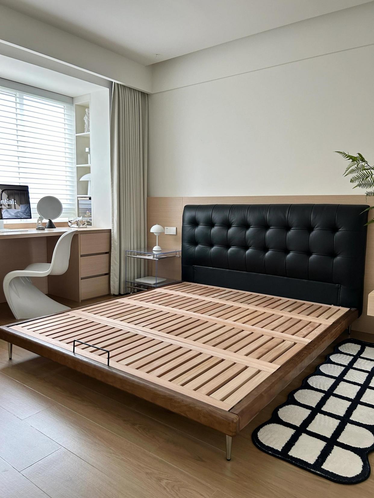 床的款式五花八门,单看床腿设计就有两类,直接落地安装的款式,还有带四条腿支撑的床架。这两种床,居住体验差别可不小,个人建议优先选四条腿支撑的,尽量避开落地床。
