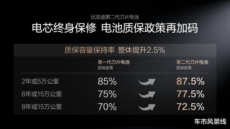 第二代刀片电池通过打造“锂离子高速通道”和“全温域智能热管理系统”,实现了更低的产热和更高效、均匀的散热,让闪充对电池寿命几乎没有影响。基于这样的底气,比亚迪还宣布电池质保政策再加码!第二代刀片电池质保的“容量保持率”整体提升2.5%,电芯依旧是“终身保修”,这就是第二代刀片电池,给所有用户的安心承诺。