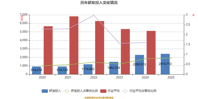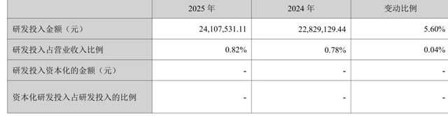 2025年全年,公司研发投入金额为2410.75万元,同比增长5.6%;研发投入占营业收入比例为0.82%,相比上年同期上升0.04个百分点。