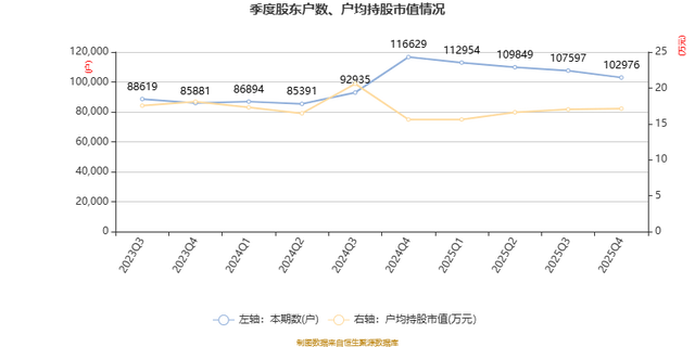 筹码集中度方面,截至2025年末,公司股东总户数为10.3万户,较三季度末下降了4621户,降幅4.29%;户均持股市值由三季度末的17.02万元上升至17.13万元,增幅为0.69%。