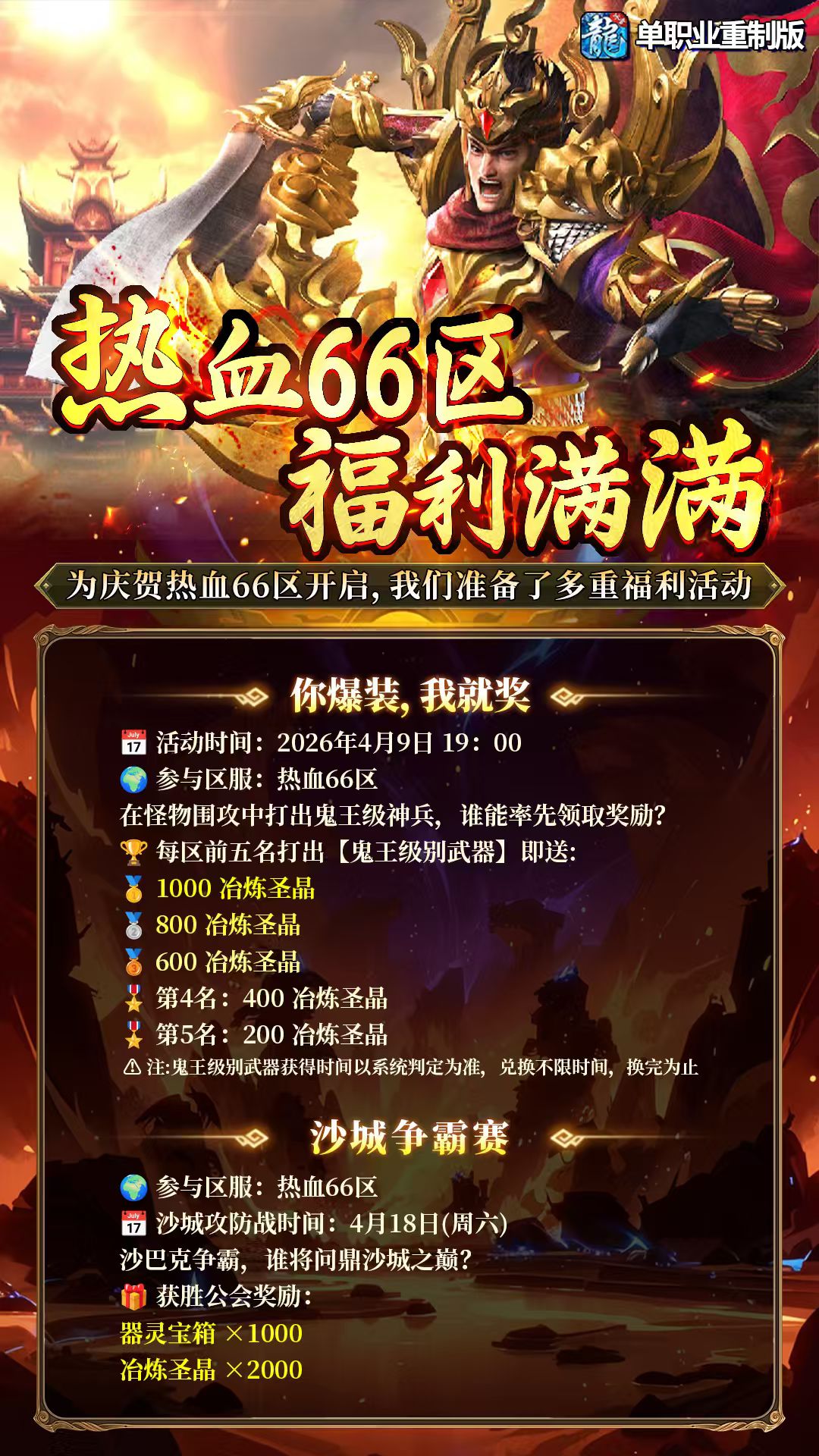 ⚔️ 传奇不老,热血重燃!今晚 19 点,热血 66 区,我们不见不散!叫上当年的兄弟,再战冰雪大陆,重铸沙巴克荣光!