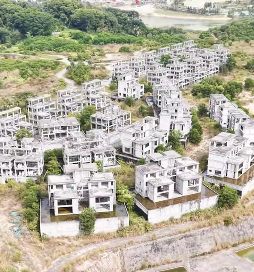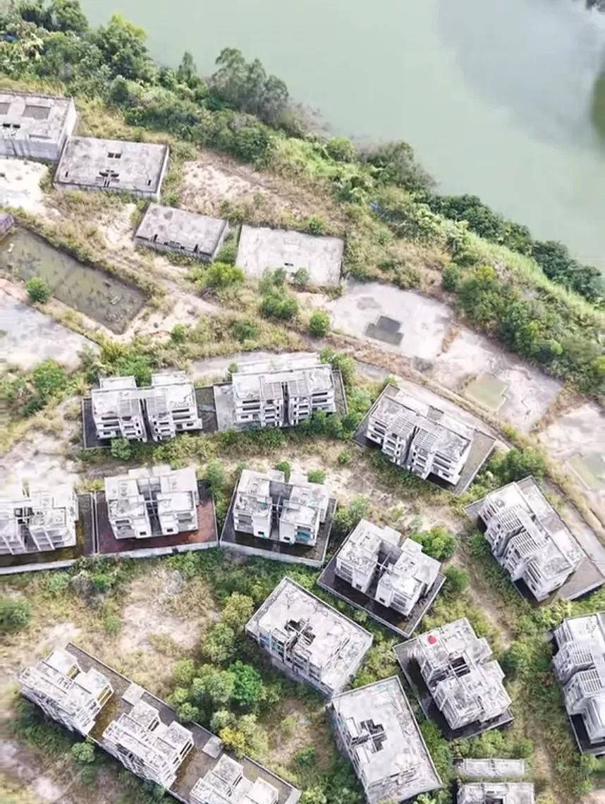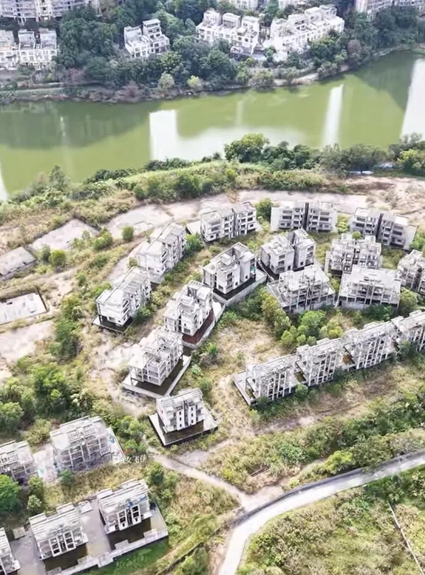 占据着开阔的湖景,本应是让人向往的居所,如今却只剩下一排排空洞的水泥框架。墙面被层层叠叠的爬山虎覆盖,院子里的野草长得漫过腰际,未装门窗的开口像一双双空洞的眼睛,望着湖面发呆。雨水在毛坯房里积起一片片浅潭,泛着暗淡的光,偶尔还能听见风穿过空荡楼体的呜咽。