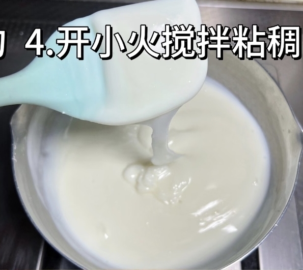 接下来是最需要耐心的环节——熬煮。开小火,保持锅具微微受热,同时用刮刀不停搅拌,千万不能离开灶台,也不能让液体煮沸。随着温度慢慢升高,牛奶会从稀薄的液体逐渐变得浓稠,这个过程大概需要3到5分钟,当液体呈现出类似炼乳的质地,用刮刀划过锅底能留下清晰的痕迹,或者舀起一勺能缓慢流下、不易散开的状态时,就可以立刻关火了。切记温度一定不能过高,微微冒烟就足够,一旦煮沸,淀粉会瞬间结块,前功尽弃。