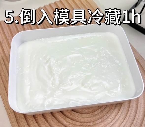 熬好的浓稠奶糊要立刻倒入提前准备好的模具中,模具可以是方形保鲜盒、玻璃烤盘,甚至是耐高温的瓷碗,只要内壁光滑即可。倒入后轻轻震动模具,排出里面的气泡,让表面变得平整。然后盖上盖子或者蒙上保鲜膜,放入冰箱冷藏室冷藏至少1小时,直到奶糊完全凝固成Q弹的块状。如果想要更扎实的口感,也可以冷藏2小时以上,时间越久,小方的形状会越稳定。