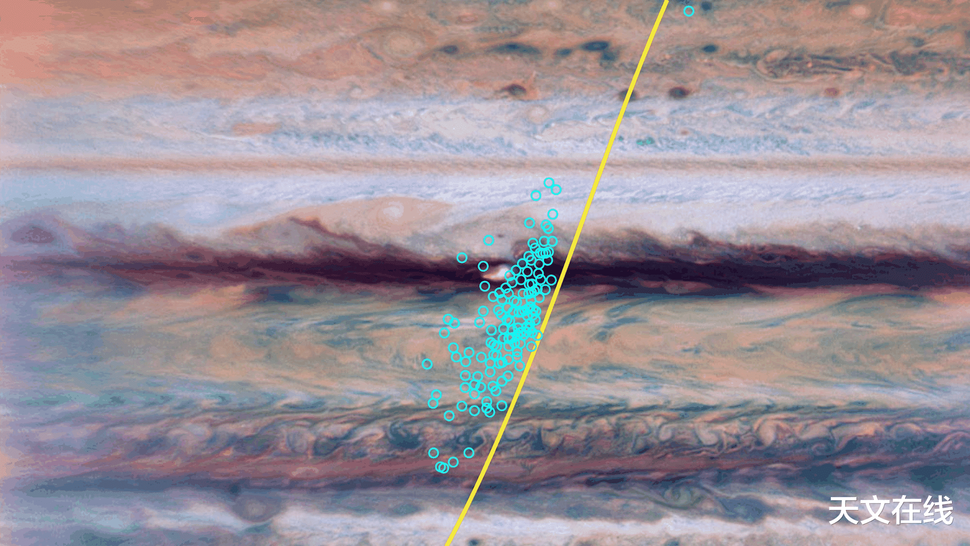 NASA的朱诺号探测器自北向南(黄色轨迹)飞越木星大气层,探测到一簇来自闪电的无线电信号(青色符号标示每次信号探测时仪器的指向)。哈勃太空望远镜拍摄的背景图像确认,该闪电源自一个孤立的隐形超级风暴。