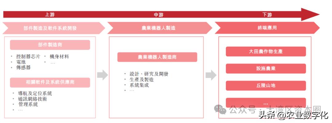 农业机器人行业上游由电池、芯片、机构件、导航及定位系统、通讯技术等组成;中游为农业机器人本体制造商;下游为终端应用包括大田农作物生产、丘陵山地等。农业机器人主要产品为农业无人机,还包括无人插秧机、采摘机器人等。