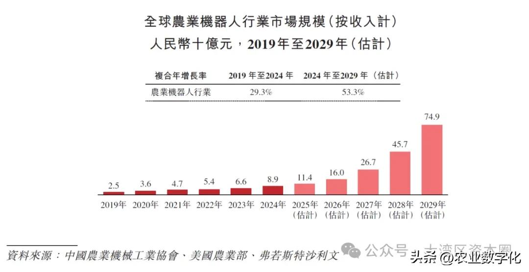 全球农业机器人市场规模由2019年的人民币25亿元增长至2024年的人民币89亿元,预计到2029年,全球以53.3%复合增长率增长至人民币749亿元。