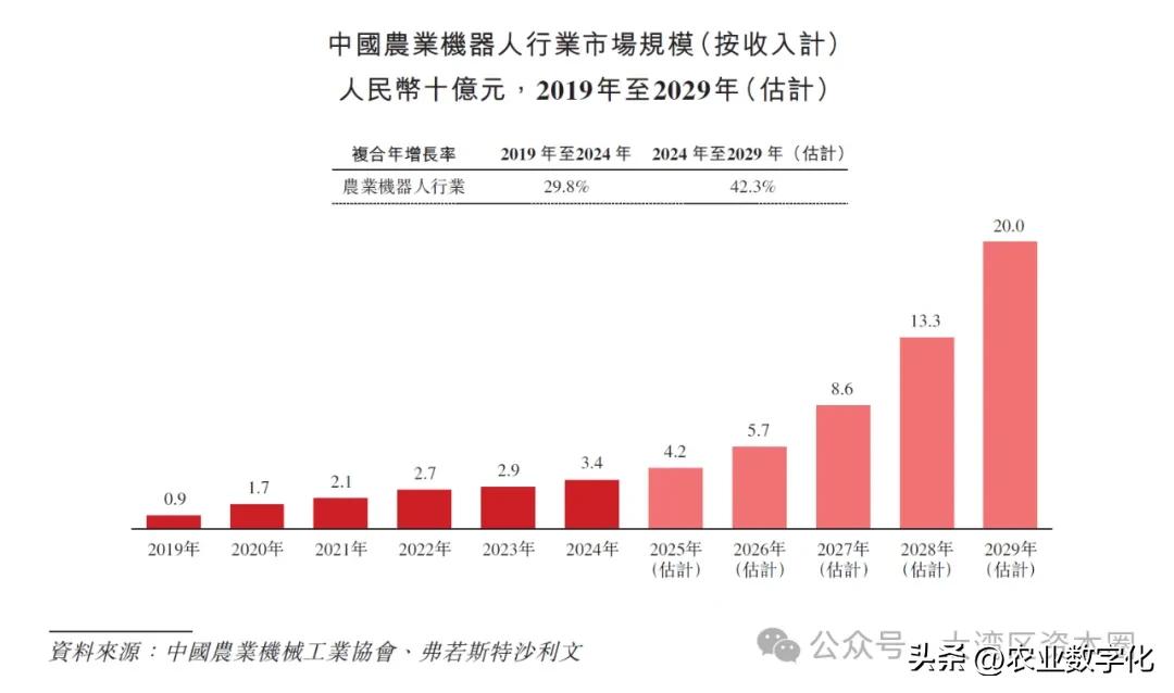 中国农业机器人市场规模由2019年的人民币9亿元增长至2024年的人民币34亿元,预计到2029年,中国以42.3%复合增长率增长至人民币200亿元。未来国内农业机器人将应用到育种、除草、以及果园、丘陵、山地等更多农业场景。