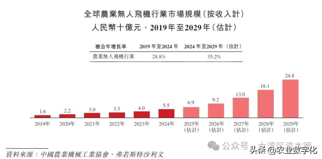 全球农业无人机市场规模由2019年的人民币16亿元增长至2024年的人民币55亿元,预计到2029年,全球以35.2%复合增长率增长至人民币248亿元。