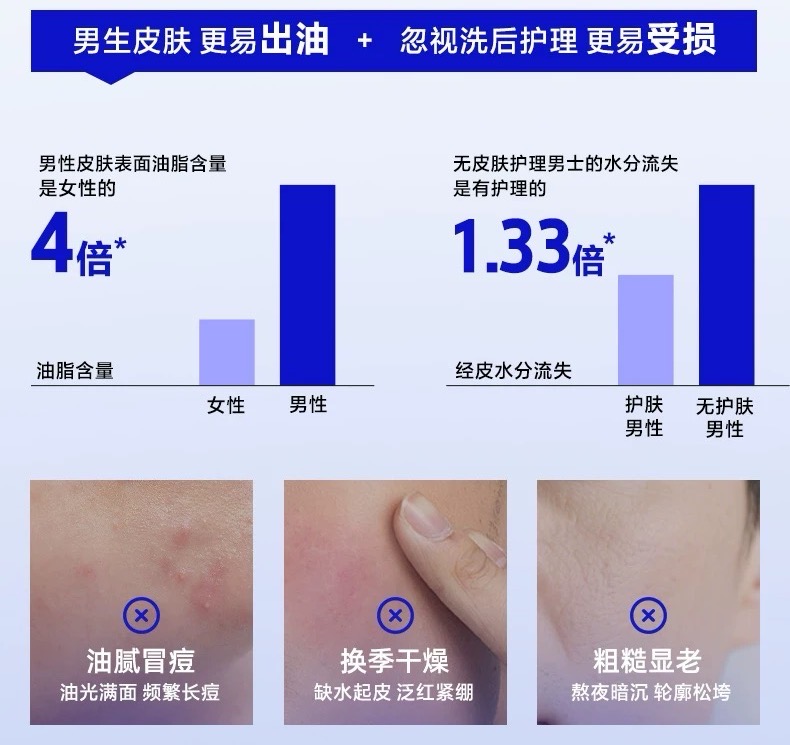 特别值得一提的是它的舒缓成分,积雪草苷和尿囊素能有效缓解换季敏感,很多男生反馈冬天用这套水乳,既不会像普通保湿产品那样闷痘,又能避免控油产品导致的紧绷脱皮。对于需要跨越温差较大环境的通勤族来说,这套是秋冬维稳的可靠选择。