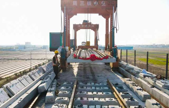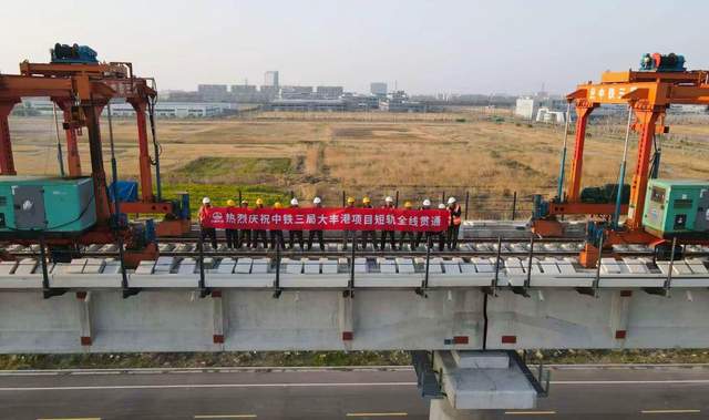 3月27日,随着大丰港特大桥最后一组25米轨排精准铺设在桥梁上,标志着大丰港铁路支线铺轨全部完成,为全线按期通车奠定坚实基础。