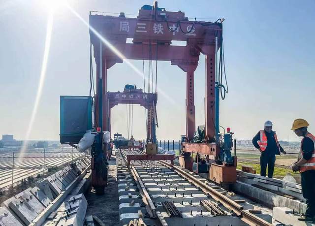 “项目部构建起了‘政府监管+代建统筹+央企施工’三方协同联动机制,快速破解电力迁改、材料运输、涉铁施工等制约铺轨进度的核心问题,提前2天完成铺轨任务”。中铁三局项目部铺轨负责人栾宁介绍,“项目部还应用自主研发的工程线管理调度系统,能够全天候对铺轨机、长轨运输车、焊轨车等设备的运行状态及作业位置进行监控和统一调度指挥,避免交叉干扰,有效提高了铺轨速度”。