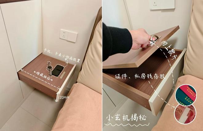 在柜子靠近床的位置预留了一个抽屉式层板,拉开后的台面可以做床头柜用;层板上拉后会出现一个暗藏的小空间可以用来放证件。