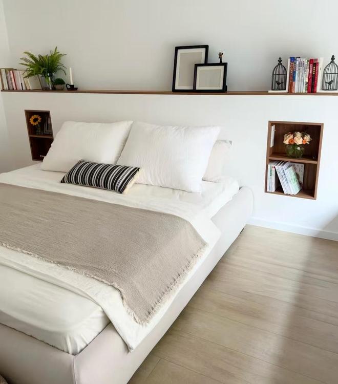 其实我们需要的不一定是正儿八经的床头柜,而是一个可以收纳物品的地方;所以,当年轻人开始接手装修后,传统的床头柜就逐渐退出中国家庭了,因为年轻人的做法更高级实用还省钱。