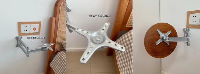 网上买了一个圆形托盘、一个显示器支架;把支架用膨胀螺丝装到床头,再把支架和托盘底部都抹上免钉胶粘到一起就可以了。