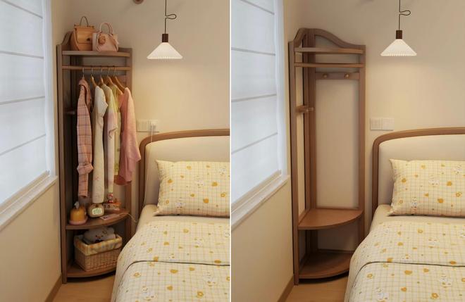 上面可以随手挂睡衣和第二天要穿的衣服,中间的层板高度几乎与床齐平,用来放纸巾、手机、眼镜没问题,下面还可以放个脏衣篓,简直就是“神仙架子”。