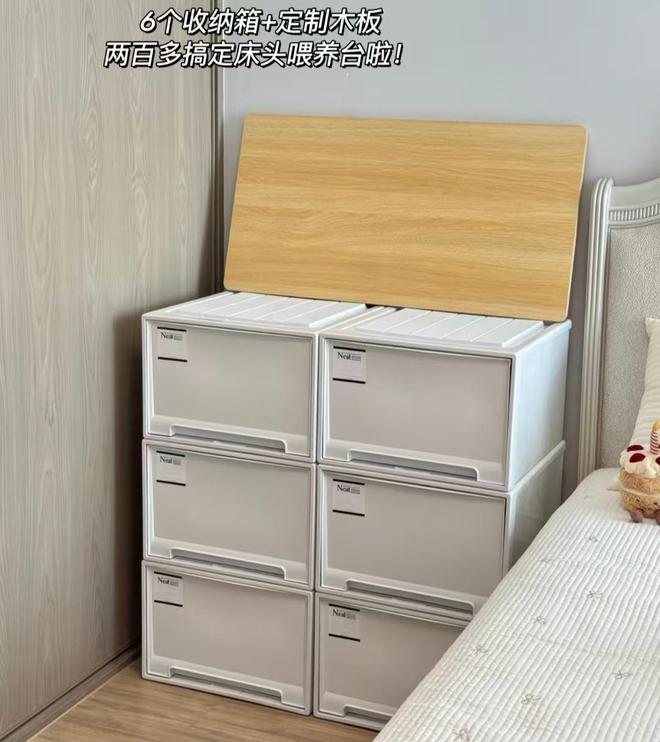 刚好在网上刷到了收纳箱,就买了6个摆放到一起后,组成了一个6个抽屉的小柜子,上面又定制了一块实木板做台面,简直太好用了。