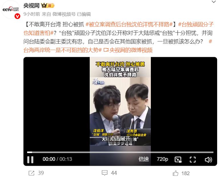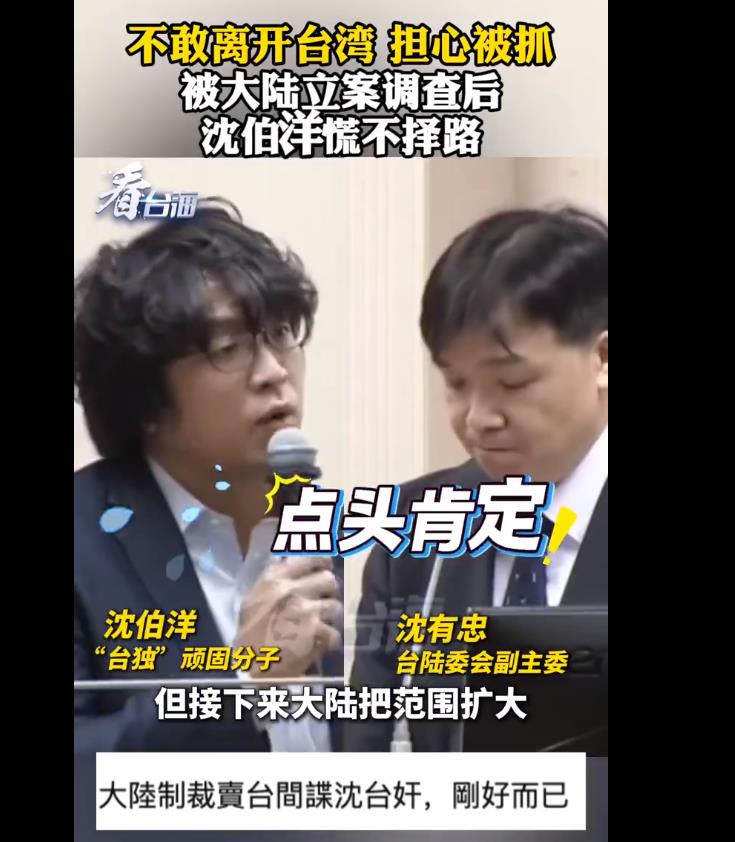 据央视消息,“台独”顽固分子沈伯洋公开称对于大陆惩戒“台独”十分担忧,并询问台陆委会副主委沈有忠,自己是否会在其他国家被抓,一旦被抓该怎么办?
