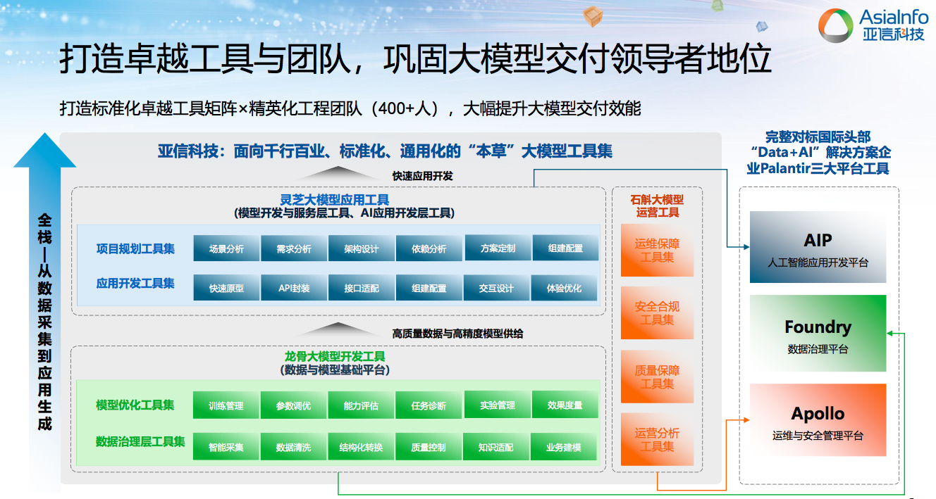 据了解,亚信科技将其对标Palantir三大平台Foundry、AIP、Apollo的工具集和方法论归纳为底层的龙骨大模型开发工具集、中层的石斛大模型运营维护工具集和上层的灵芝大模型应用工具集,交付和开发团队已经接近400人的规模。三组工具集越迭代越强,在不同行业里能够通用,所谓“工具的效能发挥越大,毛利率会越高”。