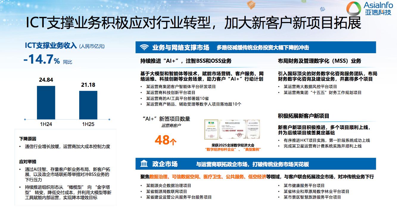 很明显,通信行业的传统业务如通话、短信等增长乏力,新业务如政企云网和AI等,均面临互联网行业的强力竞争和挤压。在这样的态势之下,老牌通信行业服务商亚信科技2025年上半年也受此影响,营业收入约为人民币25.98亿元,同比下降13.2%。