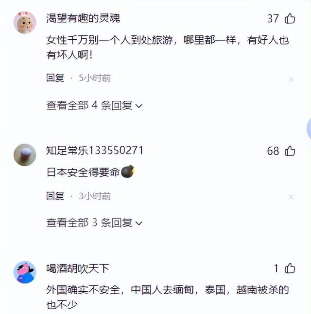 也有网友提醒,特别是女性,独自外出旅行时要格外小心,因为无论在哪个地方,都难免会遇到好人和坏人。
