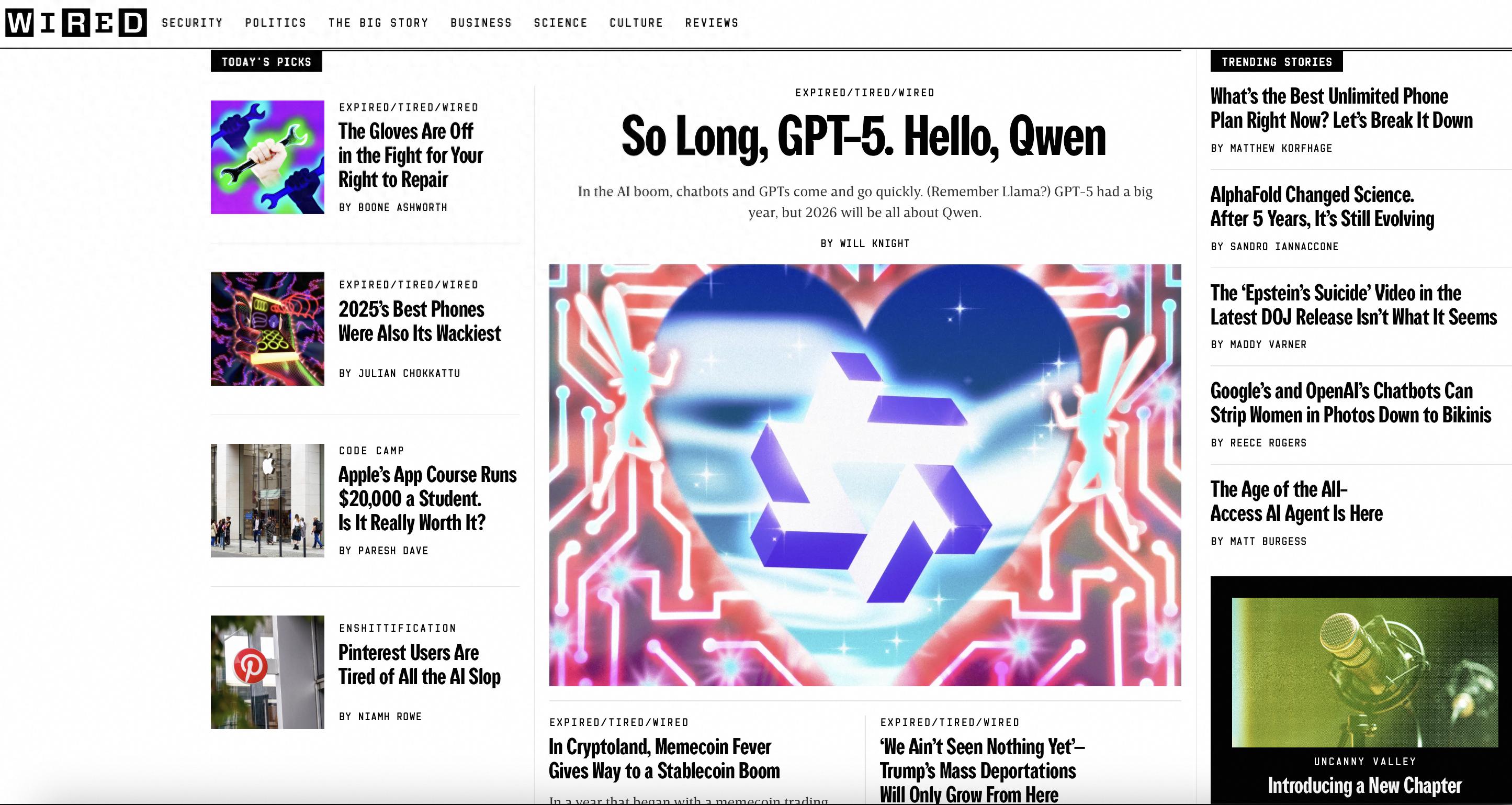 《连线》(WIRED)是全球顶级科技媒体之一,《失控》作者凯文·凯利是该杂志创始主编,《连线》对科技及行业趋势的精准洞察,在硅谷和华尔街享有“数字时代圣经”的美誉。每年年末,《连线》会刊出对全球科技预测的前瞻文章,《再见,GPT-5。你好,千问》即是年终重磅文章系列之一。
