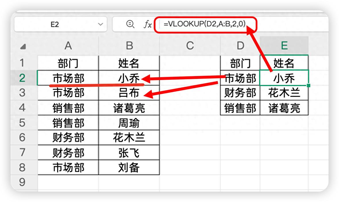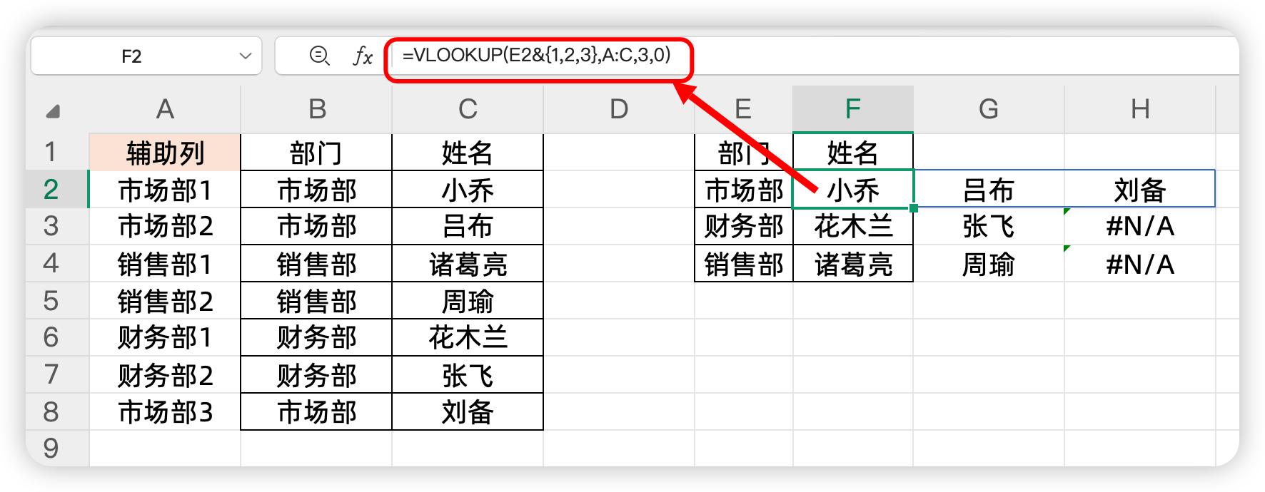然后如果我们想要查找其它部门时,只需要向下填充,就可以得到所有的结果: