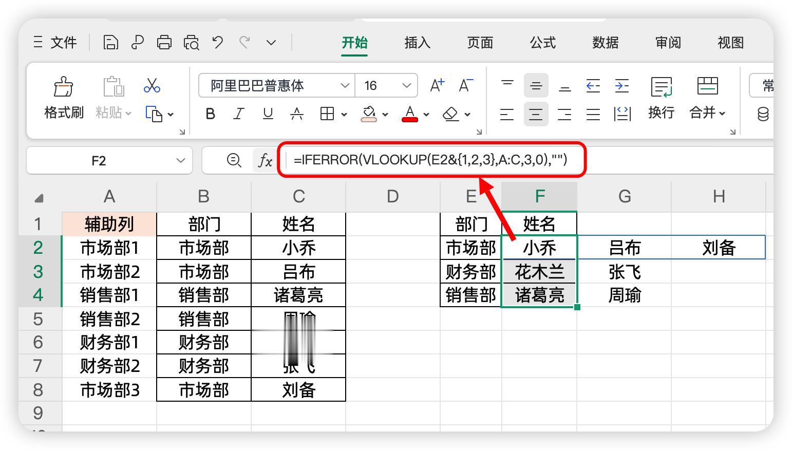 我们可以根据辅助列,来查找匹配我们想要的结果,我们在F2单元格输入公式:
