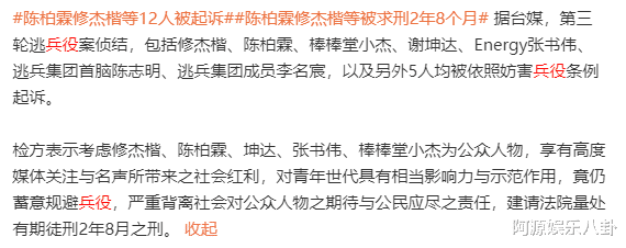 选择了自首,承认自己伪造高血压逃兵役的事实。落马艺人再多一个。然后就到了今天。经过警方一个多月的侦讯调查,第三轮逃兵役案侦结。一共12个人被依照妨害兵役条例起诉。其中除了修杰楷、陈柏霖、棒棒堂小杰、谢坤达、Energy张书伟外,还有操作逃兵役事件的集团首脑陈志明、集团成员李名宸,以及其他5人。检方觉得几个艺人享受到了公众人物的红利,对社会和青少年有示范作用具有形象力,却不尽公民责任做出严重背离社会期待的行为,对他们应该加重处罚。因此要求对这几个人求刑2年8个月。