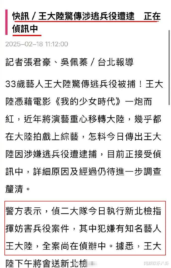 也就是说。如果检方诉求达成的话,分分钟台湾省监狱里将星光熠熠,场面都要胜过金钟奖欸。回望全过程,这场由王大陆逃兵役引发的血案,实在是太狗血戏剧化了。这么跟你们对比一下就好理解了,大概就是吴亦凡他妈报警却最终把凡凡送进去的离谱程度。来吃一口这个王大陆亲手炮制出来的超级大瓜。复盘全过程,从开始到结局,你都会惊掉下巴 ↓事情要从今年2月说起。2月18号,《我的少女时代》成名的男演员王大陆(因为嘴巴大在内地还有个花名脆脆鲨)突然被公开逮捕了,被捕照闪亮登上头版头条。