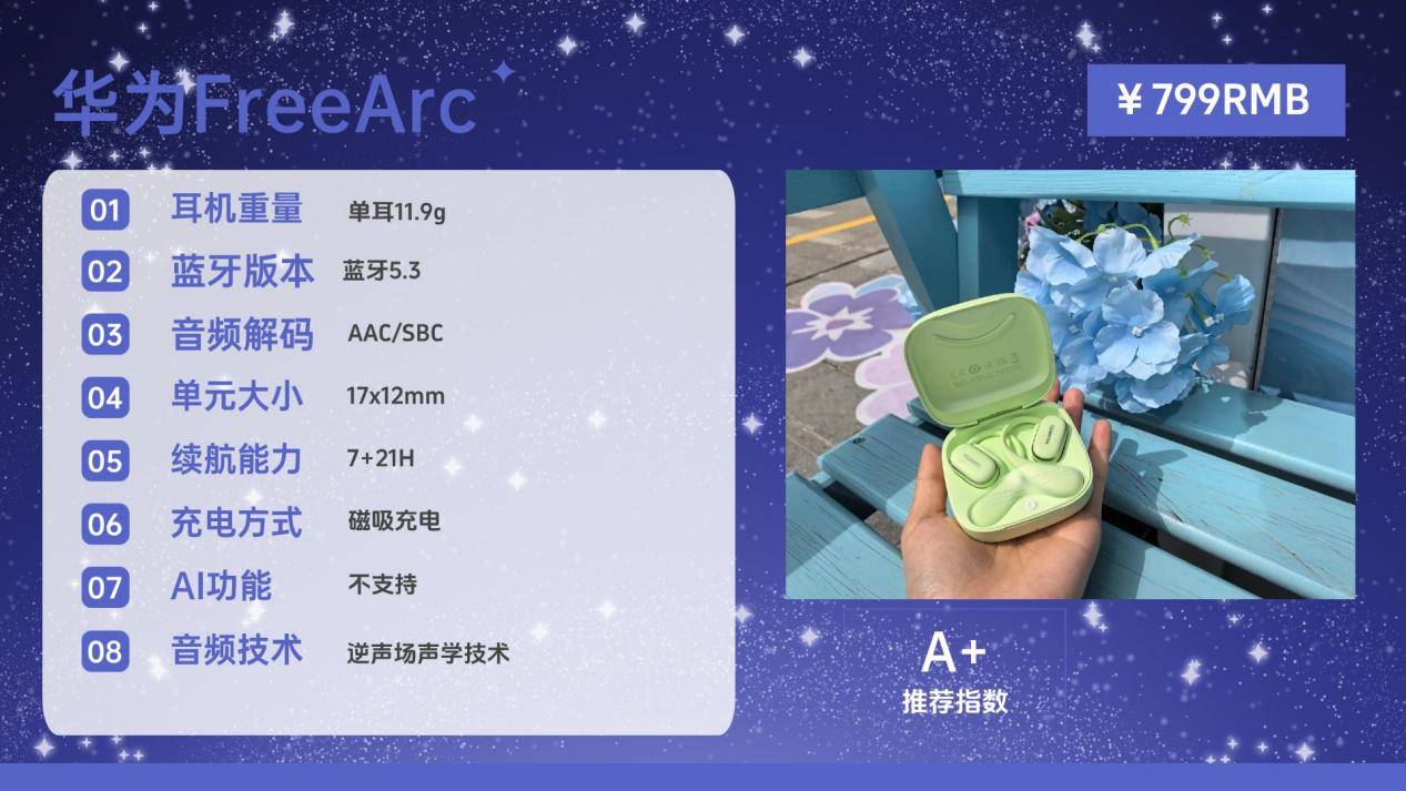 在音质方面,华为Free ARC耳机配备13.4mm镀钛动圈单元,并设计有双调音孔,从理论上可优化声场效果。但实际听感偏向平稳,高频清晰度一般,解析力处于中等水平,低频表现略显不足。整体音质适合日常场景,如通勤或居家背景音乐,即便对高保真要求不高的用户,也能满足基础听音需求。