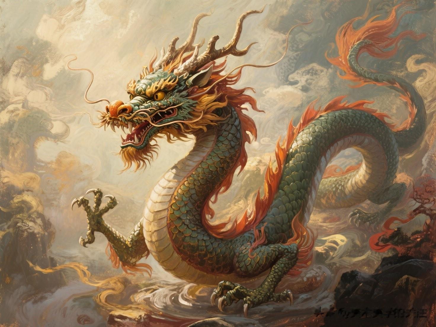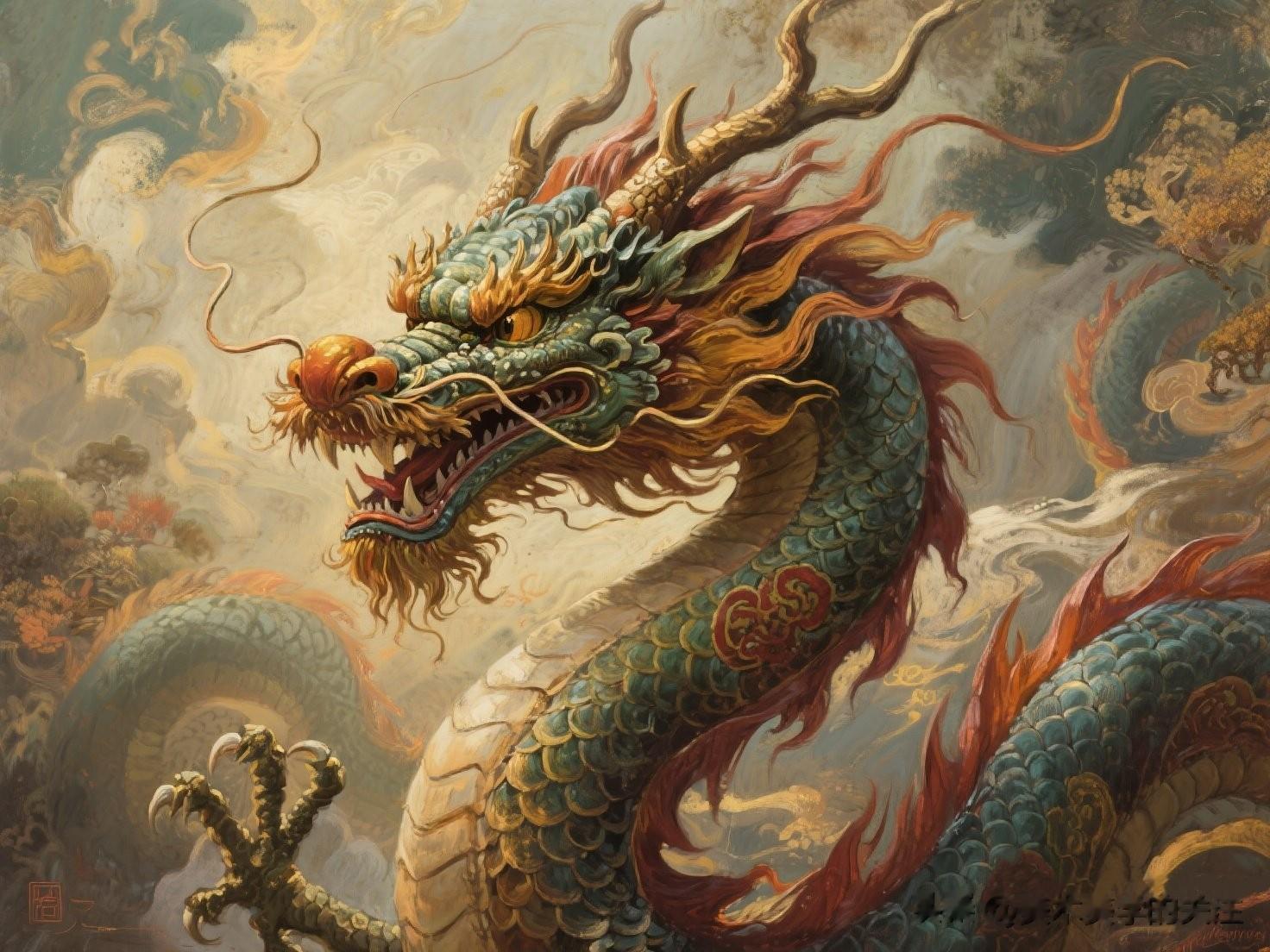 在画面的构图方面,画家展现出了高超的布局能力。龙占据了画面的主体位置,它的身体几乎填满了整个画面空间,给人一种强烈的视觉冲击力。龙的姿态呈一种向上腾飞之势,这种动态的构图让整个画面充满了生机与活力。同时,画家巧妙地利用龙身的蜿蜒曲折,将画面分割成不同的区域,使得画面既有整体感又不失变化。在龙身的间隙中,画家还点缀了一些中国传统的元素,如红色的火焰和古老的符文,这些元素进一步丰富了画面的文化内涵。
