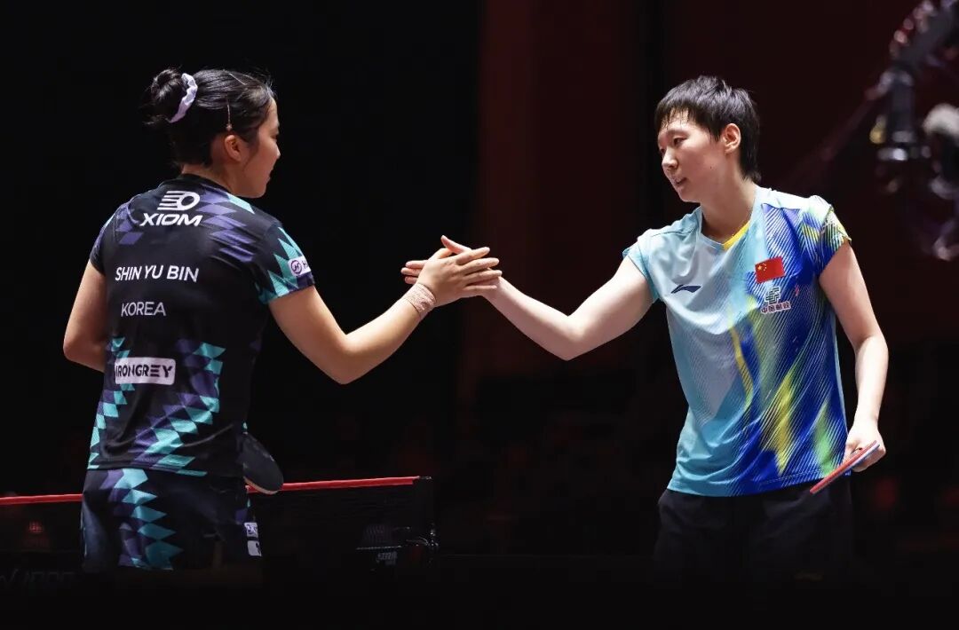 第二局王曼昱11-7拿下,第三局王曼昱11-8拿下,第四局双方多次打平,非常胶着,王曼昱坚决执行技战术,多次化解申裕斌的高质量进攻,有惊无险13-11赢下比赛。在比赛结束的那一刻双方友好握手。申裕斌的发挥几乎无可挑剔,但她遇到的是世界上最好的球员之一王曼昱,是申裕斌未曾战胜过的选手,只能吞下败局。王曼昱心理素质过硬,从首局的被动胶着但到后面的掌控比赛局面,王曼昱的防守厚度以及稳定性都是“摧毁”申裕斌自信心的利器。