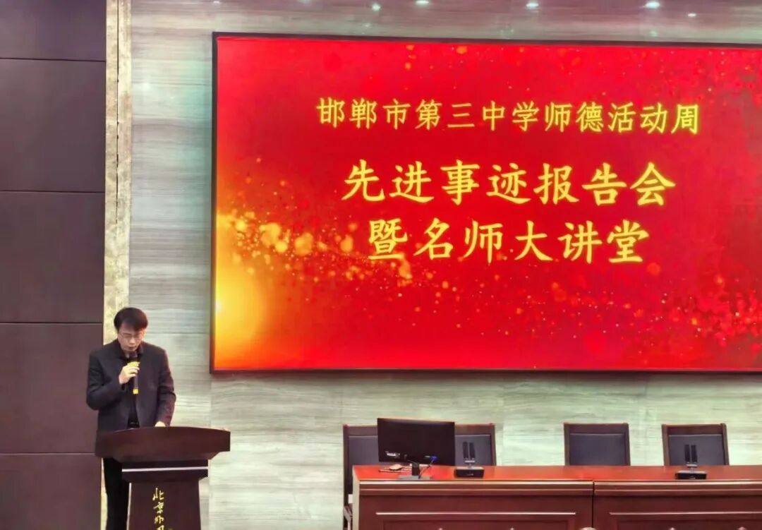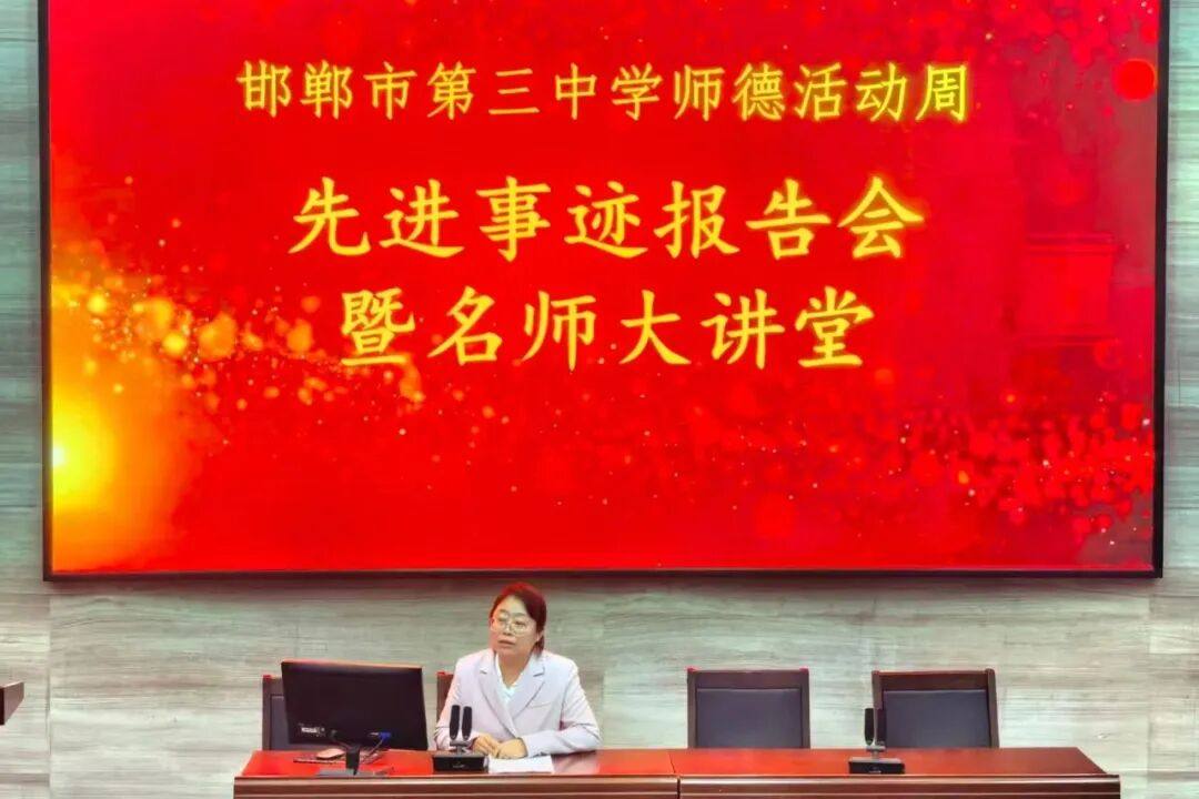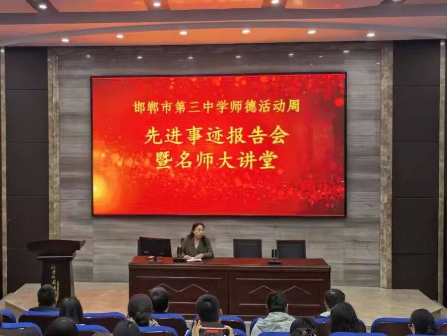 为深入推进师德师风建设,充分发挥先进典型的示范引领作用,邯郸市第三中学于2025年10月16日下午在阶梯教室隆重举行“师德教育活动周”先进事迹系列报告会。报告会是该校师德教育活动周的重要组成部分,旨在通过身边榜样的力量,激励广大教师不忘初心、牢记使命,争做“四有”好老师。
