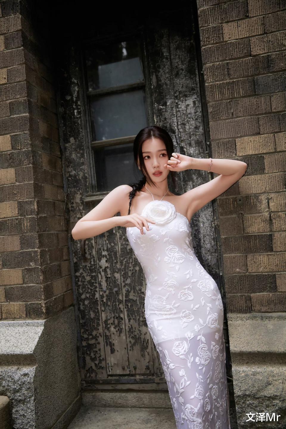 镜头里的她裹着一袭立体玫瑰刺绣抹胸裙,露出的肩颈线像被月光磨过的玉,锁骨窝浅浅盛着绣球花瓣的影子。她偏爱的单侧麻花辫是点睛之笔:碎发勾着下颌线,把原本圆润的鹅蛋脸拉出清冷的锐角,而那双标志性的杏眼一垂,又把 “纯欲感” 焊在了眉眼间距里。