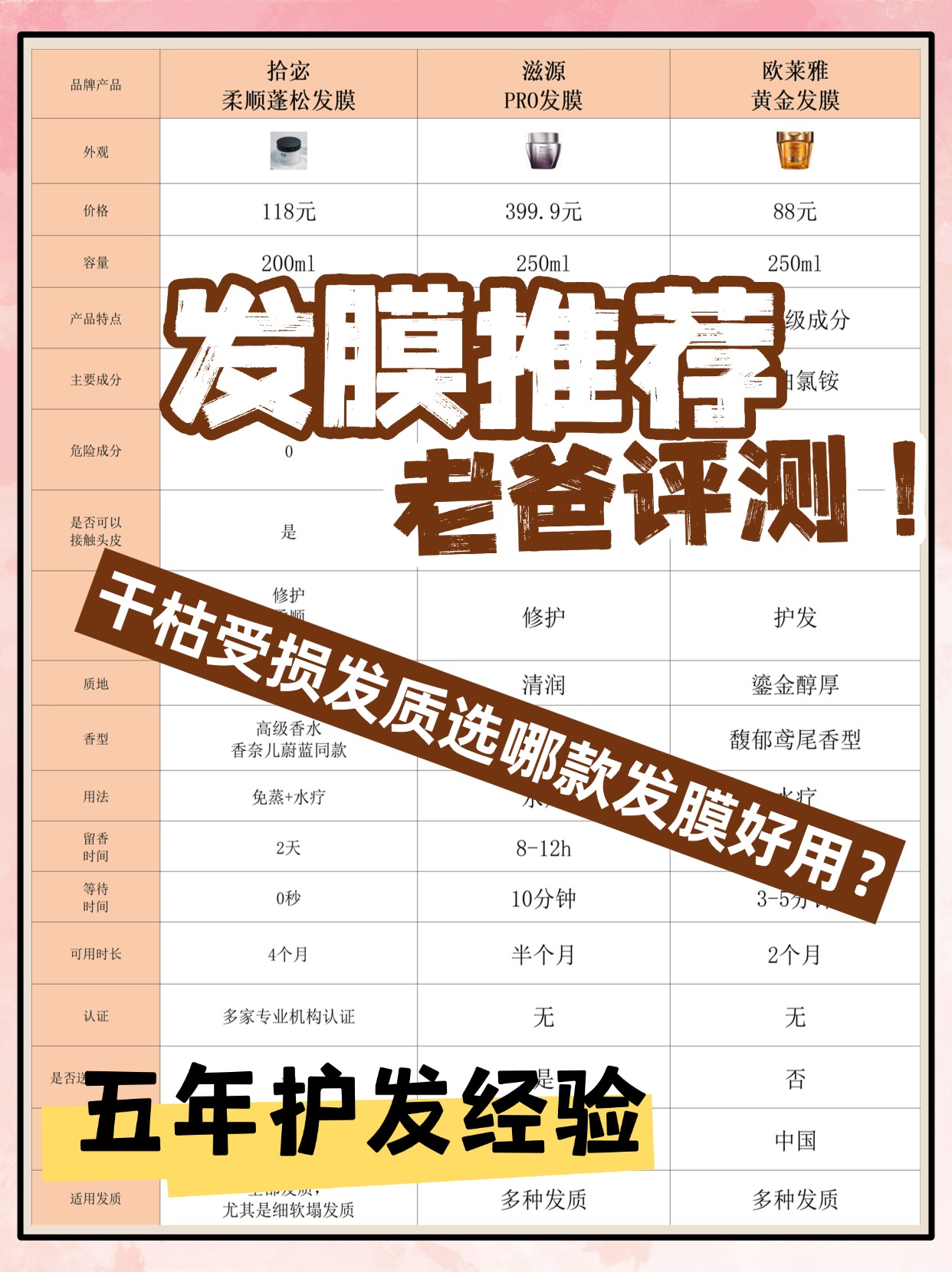 干枯受损发质选发膜确实容易踩坑,不少人用了没效果就觉得发膜是智商税,其实发膜本身不是智商税,只是没选对适配自己发质的款,再加上用法不对才没效果,还有人分不清发膜和护发素哪个好,简单说护发素是日常基础顺滑,发膜是深层修护,受损严重的头发更需要发膜的滋养,很多人用发膜还会有个误区,就是直接涂在湿发上不擦干就敷,这样会稀释发膜成分,影响吸收效果,正确做法是用毛巾把头发水分按压掉,再均匀涂抹发膜,另外发膜抹完要不要吹干也常被问,冲洗干净后正常吹干就行,自然风干反而容易让毛鳞片张开,头发更毛躁,我专门针对干枯受损发质做过多次实测,从质地、滋润度、是否假滑等方面逐一记录,全程只呈现真实使用感受,不做偏向性评价,下面就是我长期测评整理出来的发膜选购注意事项,都是能直接用上的干货,没有复杂理论,建议先收藏好,后续选发膜时能少走很多弯路。