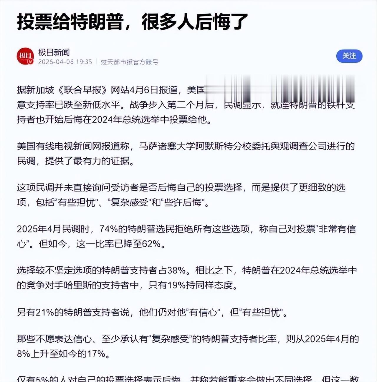 年收入5万美元以下的家庭,对他的净支持率直接跌到-22%。这群人是谁?是当年把他送进白宫的核心票仓。17%的2024年特朗普选民公开表示,后悔当初投了那一票。