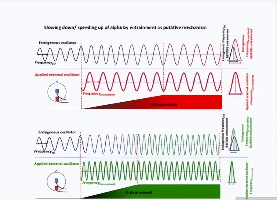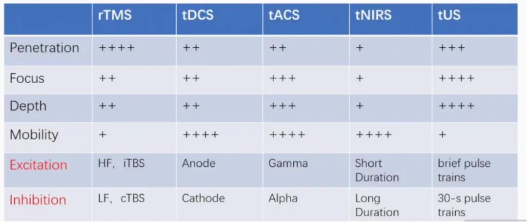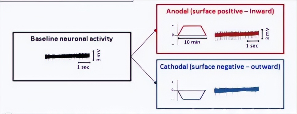 (2)电:分为直流电、交流电,穿透性为10%~20%(能量到达脑部比例),便携性佳。直流电通过阳极、阴极实现兴奋/抑制,阳极刺激增加神经元放电频率,阴极则减少。交流电则通过频率夹持改变脑部自发震荡节律,可通过调节外加频率,让脑部神经震荡向目标频率靠拢。