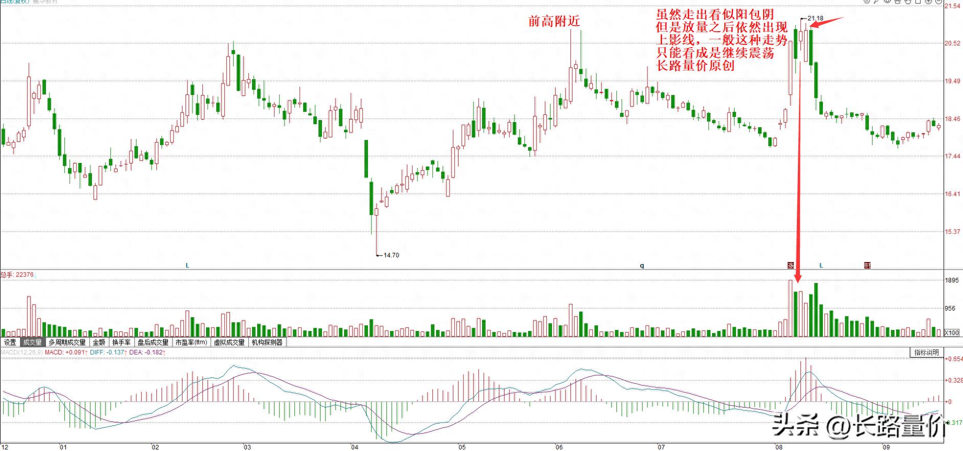 而如果虽然是出了阳线,但是阳线是没有吃掉前面的高开低走或者冲高回落的阴线,那么这种阳线只能是看成一个在压力位附近的震荡,而不能看成是突破。