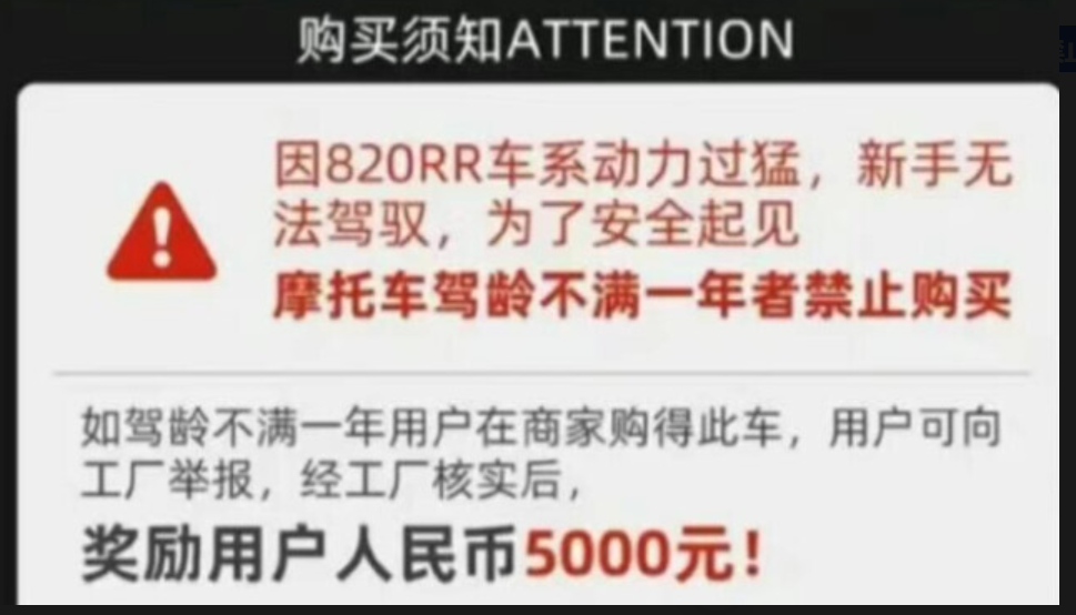 在售卖环节,张雪对其产品,其做了如下规定“因 820RR 车系动力过猛,新手无法驾驭,为了安全起见,摩托车驾龄不满一年者禁止购买该车。”