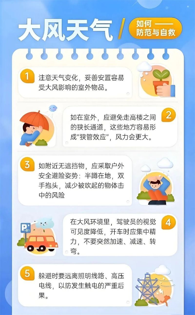 2. 中北部和东部午后多大风,需防范横风对车辆行驶的不利影响,同时督促相关单位加固户外广告牌、围挡等设施,防范高空坠物风险。