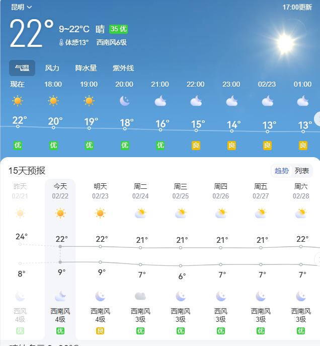 2月22日(初六):迪庆州、怒江州、丽江市北部阴有小雨,高海拔地区有阵雪或雨夹雪,昭通市北部、曲靖市东部、文山州南部、红河州南部、普洱市南部、西双版纳州、保山市西部、德宏州多云有阵雨局部中雨,其他地区多云间晴。