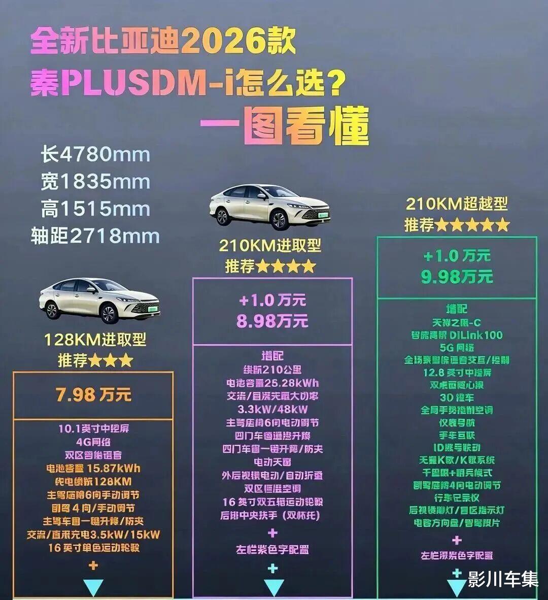 当然对于2026款的秦plus,现在这个价格绝对不是它的底线,毕竟从它1月份的销量来看,在插混市场上,吉利和奇瑞正在对其发起猛攻,面对劲敌,比亚迪想要夺回市场,只能靠降价来硬的市场。所以我个人预计到今年第三季度,26秦plus应该还会降价1万左右,那时候顶配版的秦plus可能只需要8万多就能拿下。好了今天的内容就到这里,喜欢的朋友点赞关注。