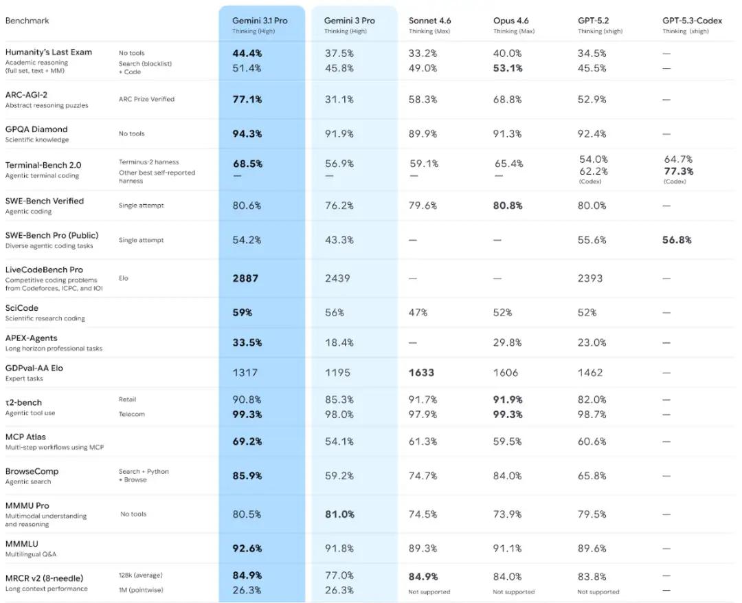 相比Gemini 3 Pro、Claude Sonnet 4.6、Claude Opus 4.6、GPT-5.2、GPT-5.3-Codex,Gemini 3.1 Pro在12项基准测试中拿下第一。