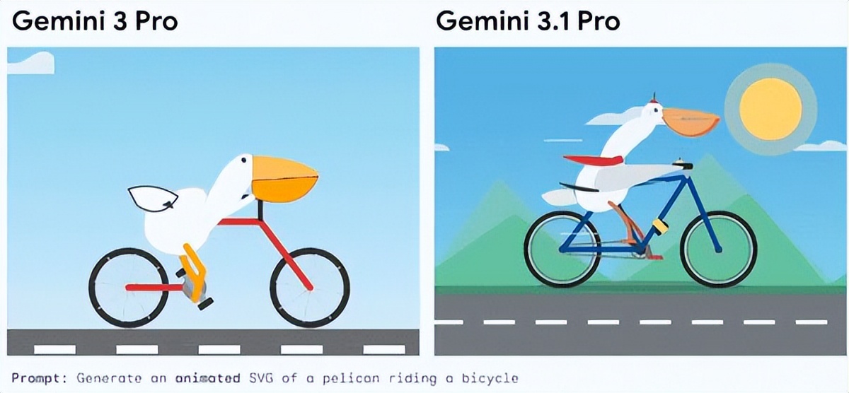 下面这一经典的“鹈鹕骑自行车SVG动画”对比,直观体现了新模型的能力提升,右侧Gemini 3.1 Pro生成的鹈鹕身体结构、骑行姿态自然合理,且自行车的车架、链条、脚踏、座椅等细节完整,相比Gemini 3 Pro的生成结果符合物理常识,更像一个完整的动画场景。