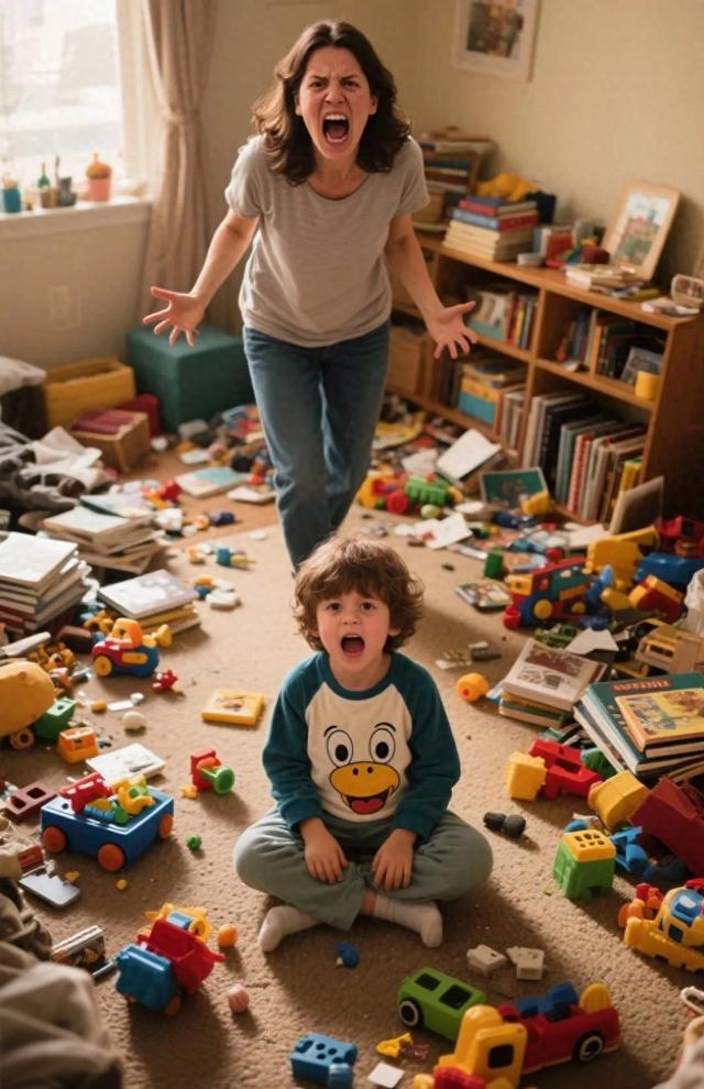 看着满地的玩具仍然一动不动,你的情绪也不好了,冲孩子吼道: