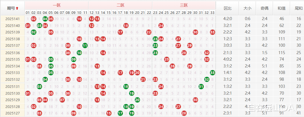 近30期开奖中,红球三区比长期保持“2-3-1”“2-2-2”等均衡分布,本次一区独揽4码的现象,在135期出现后再次出现。这往往意味着下期二、三区号码将迎来强势回补,尤其是18-33区间需重点盯防。