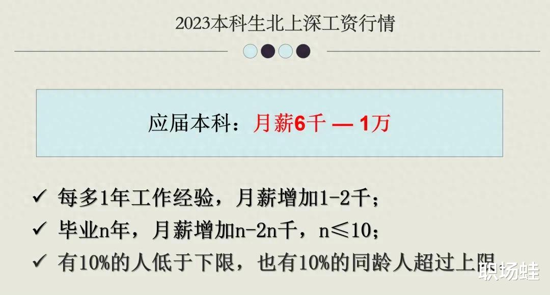 这个规律,本科毕业三四年,税前月薪大多在9-18K之间,平均值1.35K,对于上海、北京、深圳都适用,可以作为你的工作行情。