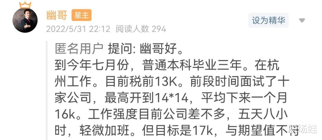 其实大家已经看得出来,她当年在杭州的同龄人工资上限就是15K,她硬是要突破17K,城市她又不投递上海,学历还是个普本不提升,加班又不愿意......她啥都不改善,也不愿意多付出工时,只会说一句“这跟我的期望不符”。你的期望是什么呢?是你个人编造的目标,你怎么不说你期望赚他一个亿呢?